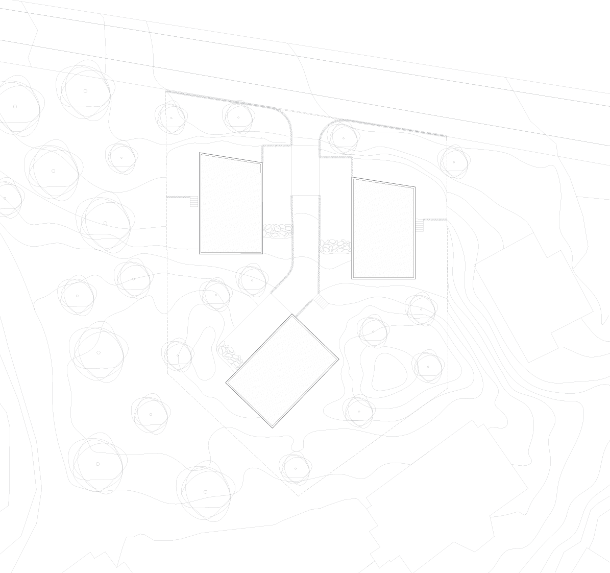 Husene er i harmoni med landskapet, tar inn natur og skog i sine romlige opplevelser. Hovedetasjen heves over veien og dyrker det usjenerte. Det private rom blir en del av trærnes kroner og stammer. Til tross for byens nærhet og byggenes kompakte plan, skapes det velvære og ro.